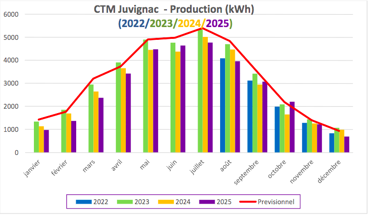 Au 31 décembre 2025, la production (33.3 MWh) est légèrement inférieure à la production de l’année précédente (- 3%), représentant un chiffre d’affaires de 3 848 euros. A noter, un arrêt de production, le 17 août 2025, de 9h à 13h30 (surchauffe de l’onduleur suspectée alors que la température extérieure était particulièrement élevée). Si, sur l’année 2025, l’ensoleillement (données station météorologique de Fréjorgues) apparaît comparable à la « normale », celui- ci a connu de fortes variations mensuelles (déficit de janvier à avril et décembre et excédents en mai, juin et octobre).
